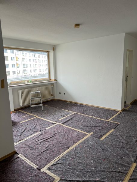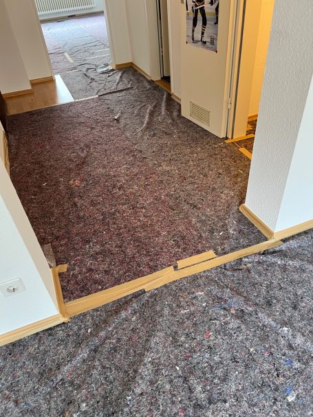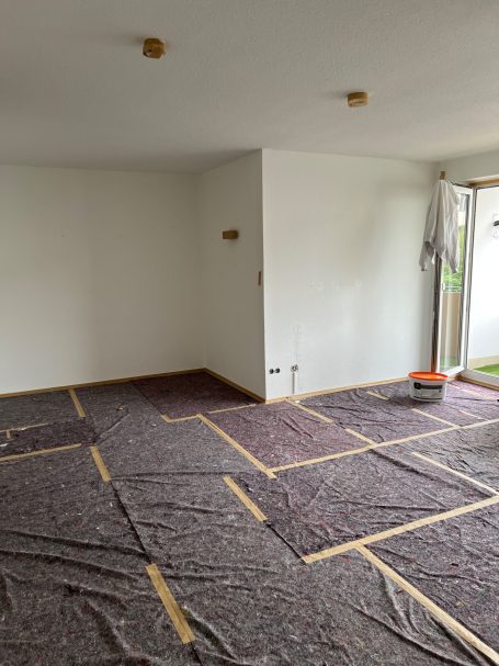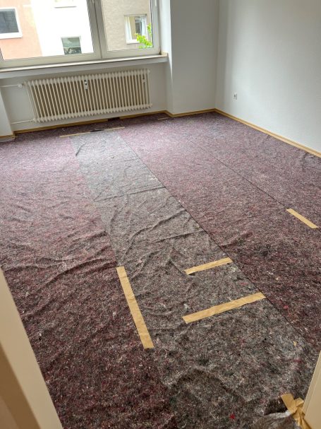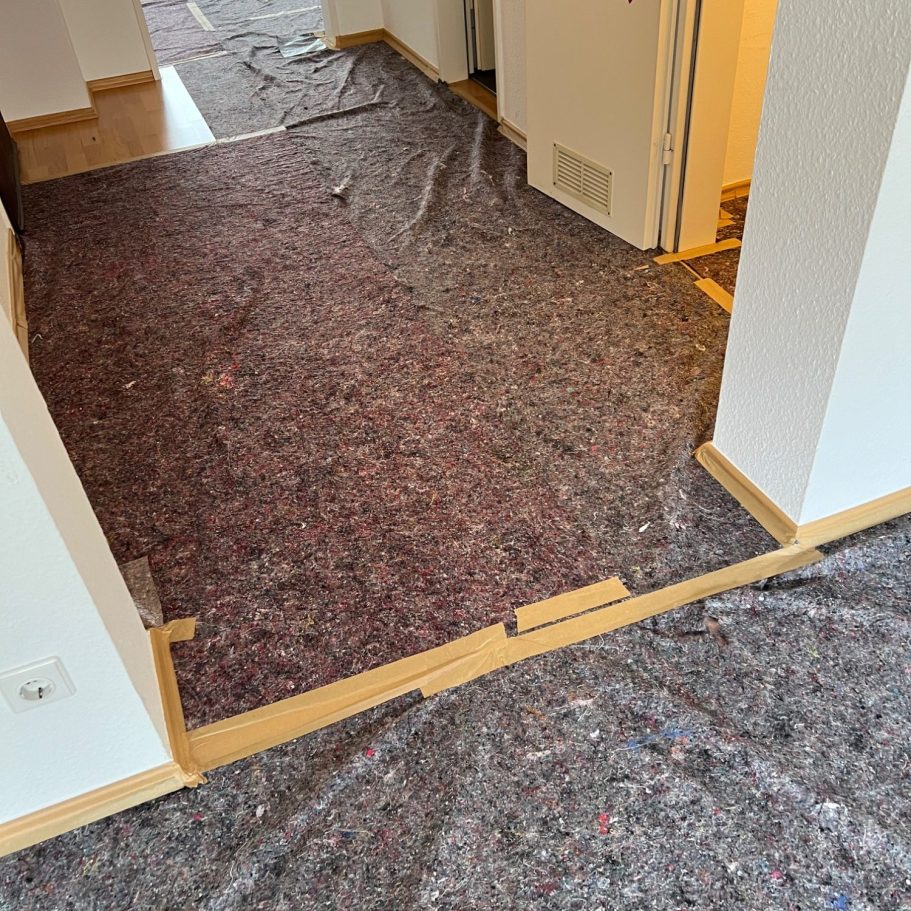 Bodenschutz: Auslegen von hochwertigem Malervlies in der gesamten Wohnung.